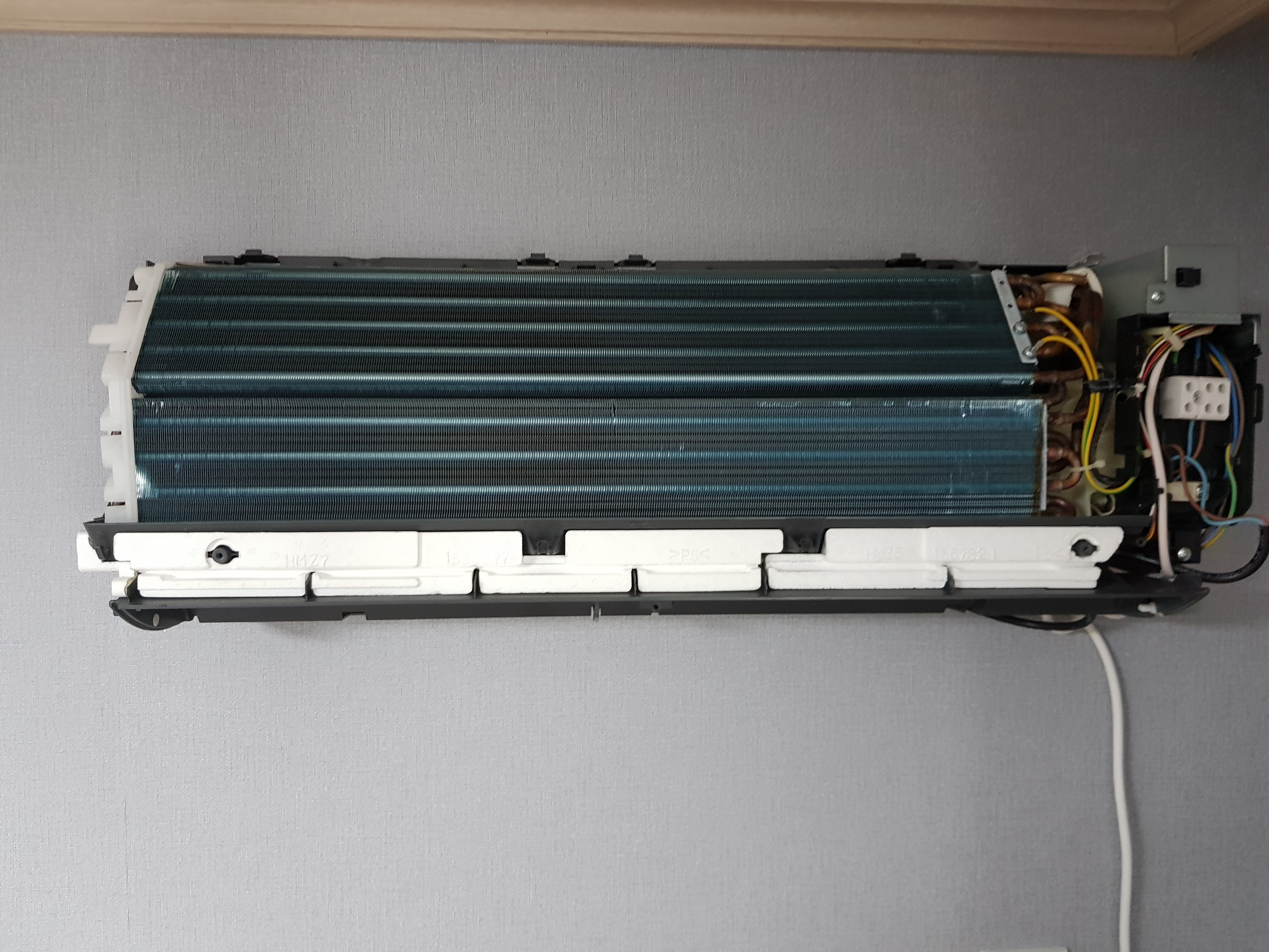 벽걸이 에어컨 케이스 분해하고 난 후의 모습. 이 안에 청소를 해야 하는 목표물이 있습니다!