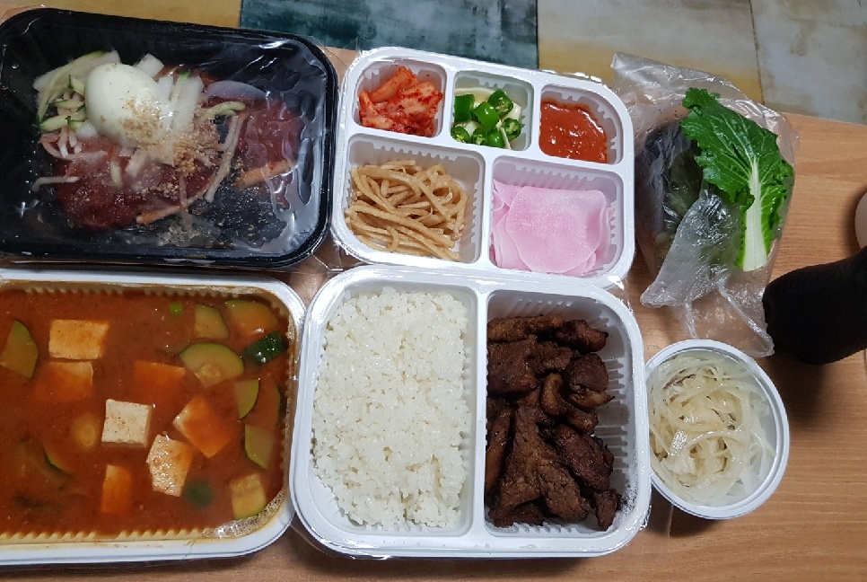 이번에는 밥이랑 고기, 된장찌개를 뜨겁게 유지시켜주기 위해서 은색빛이 나는 스티로폼 재질의 포장용기에