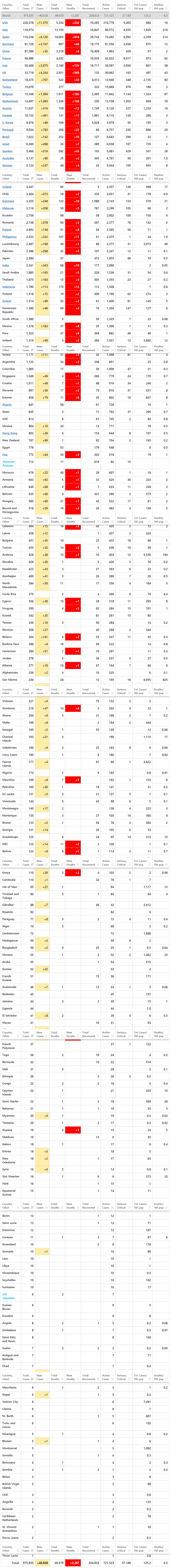 | 2020년 4월 4일 전 세계 나라별 코로나바이러스 감염자 현황 (6) | 2020.04.04 |