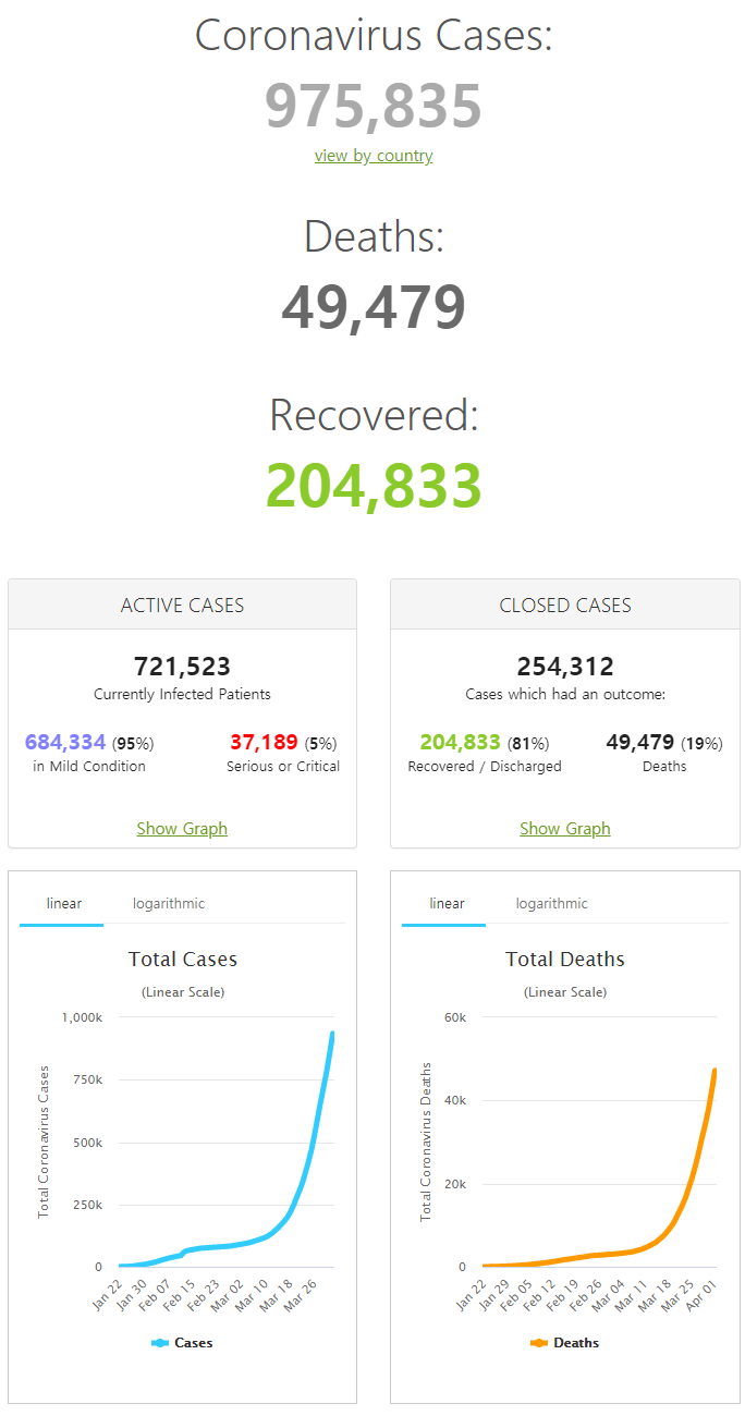 | 코로나바이러스 확산 상위 18개국. (2020.4.1 오후3시40분) (0) | 2020.04.02 |