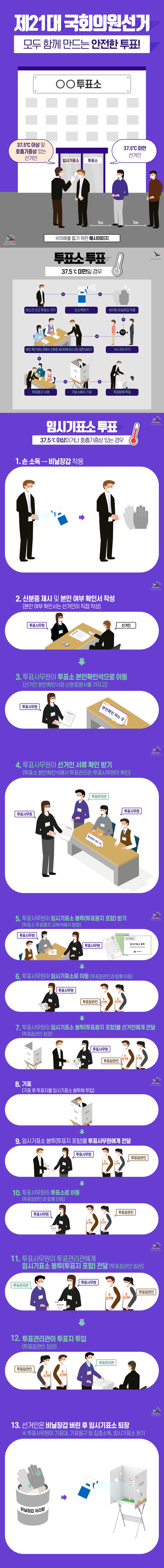 투표소에 도착하시면 줄을 설때도 멀찌감치 떨어져서 줄을 서게 합니다. 그리고 비접촉 온도계로 발열체크를 하고 손 소독제로 손을 깨끗하게 닦고 2장의 비닐장갑을 양손에 낍니다. 신분증을 내밀면 마스크를 살짝 내려 얼굴과 대조 후에 투표용지를 받아서 기표소에서 기표 후 투표함에 넣으면 됩니다.