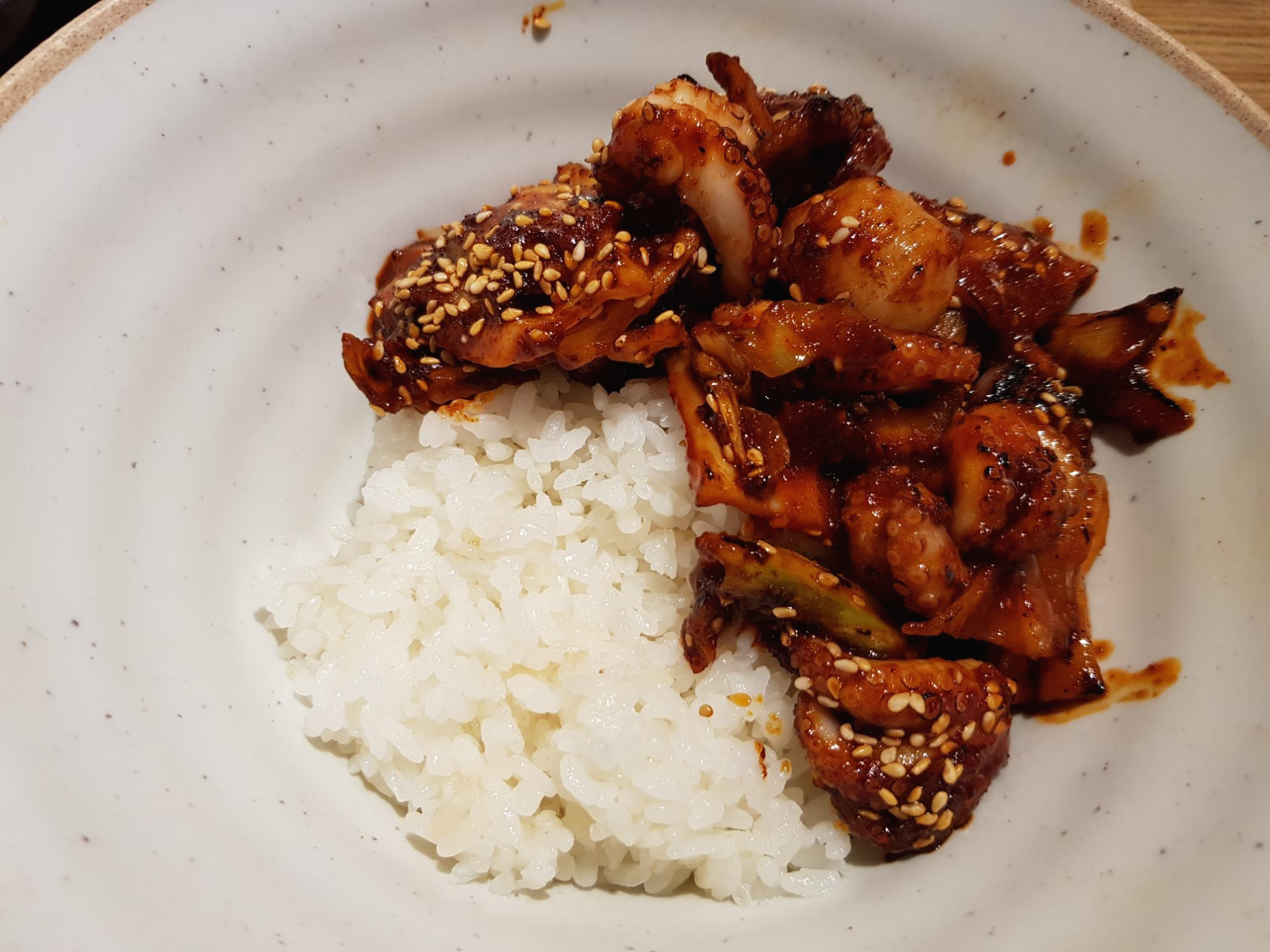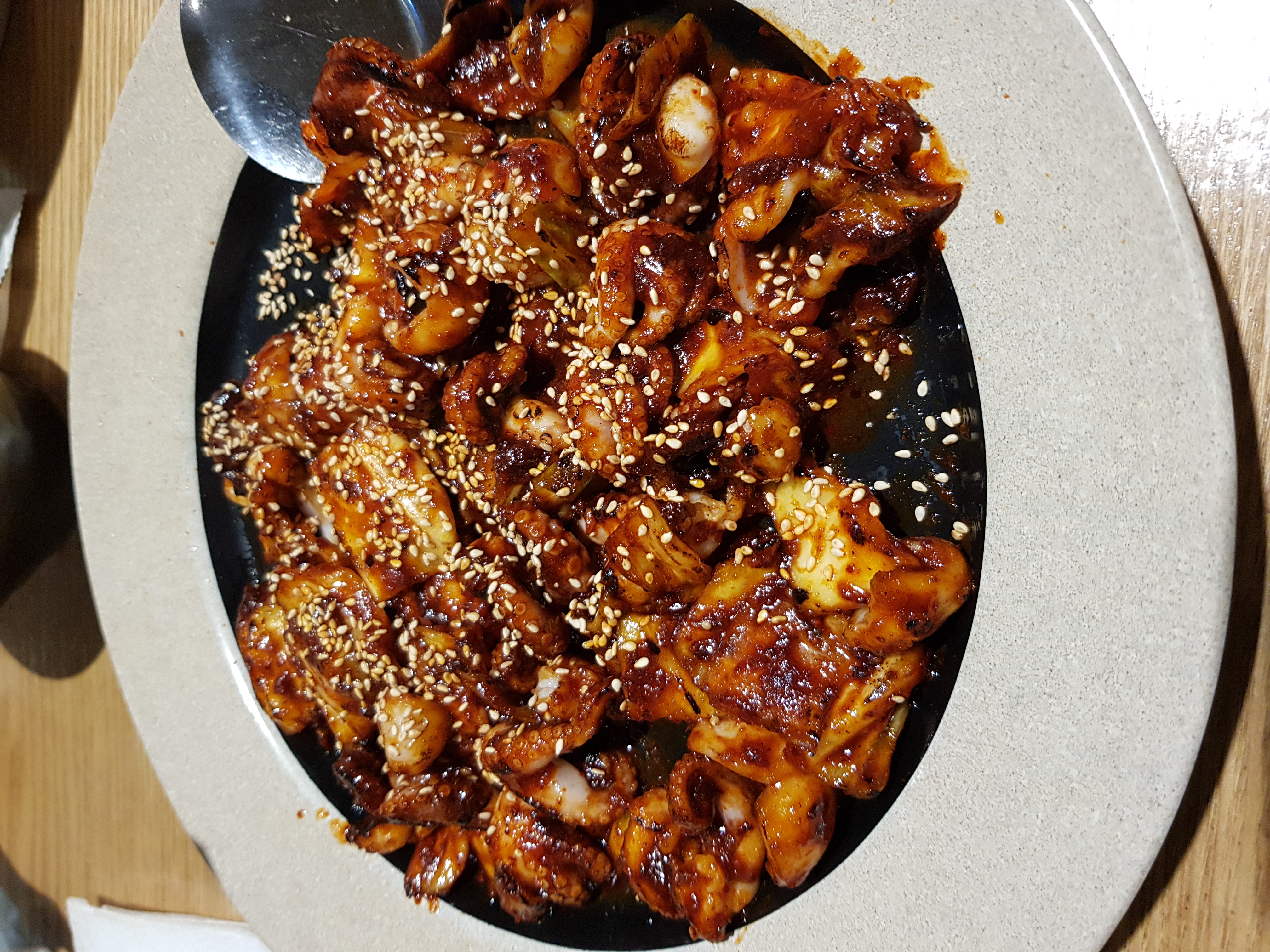 쭈꾸미를 한입 딱 먹었는데 약간 비린맛도 났어요. 이런 해산물들은 볶아줄 때 술 같은 걸 조금 넣어주면 하나도 잡내가 나지 않는데 여기는 쭈꾸미에서 해산물 비린내가 조금 났습니다.