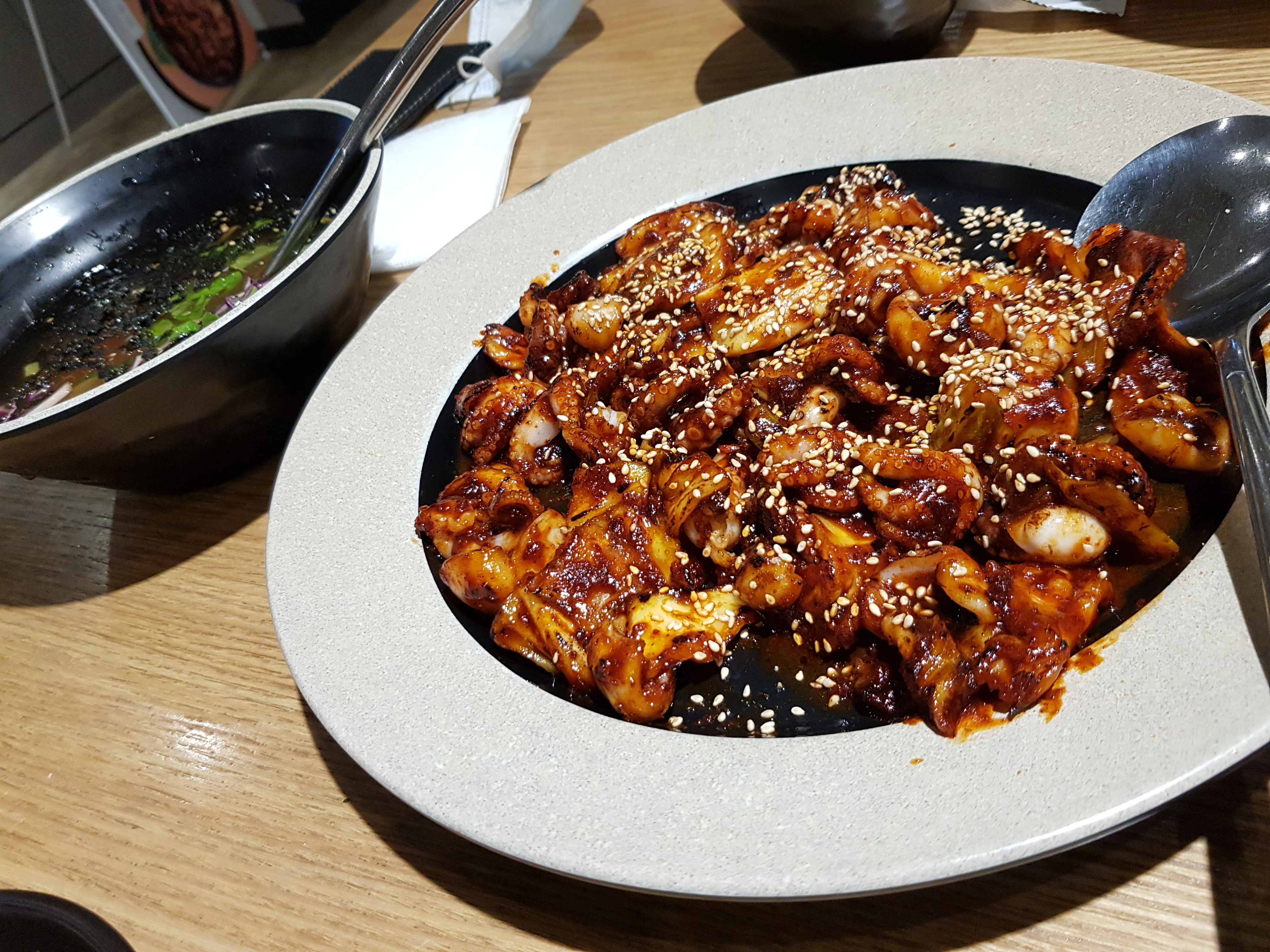 드디어 불쭈꾸미가 나왔어요. 나오는 속도도 빨랐어요. 불맛이 나기는 나는데 생각보다 많이 나지는 않았어요. 다른 쭈꾸미 전문점에 가면 이것보다 불맛이 더 나는데 이름을 불 주꾸미라고 지은 거에 비하면 어떻게 보면 약하다고 볼 수도 있는 것 같아요. 약간 순한 맛이라서 고춧가루가 덜 들어가서 불맛을 내기에 어려웠는지 모르겠지만...