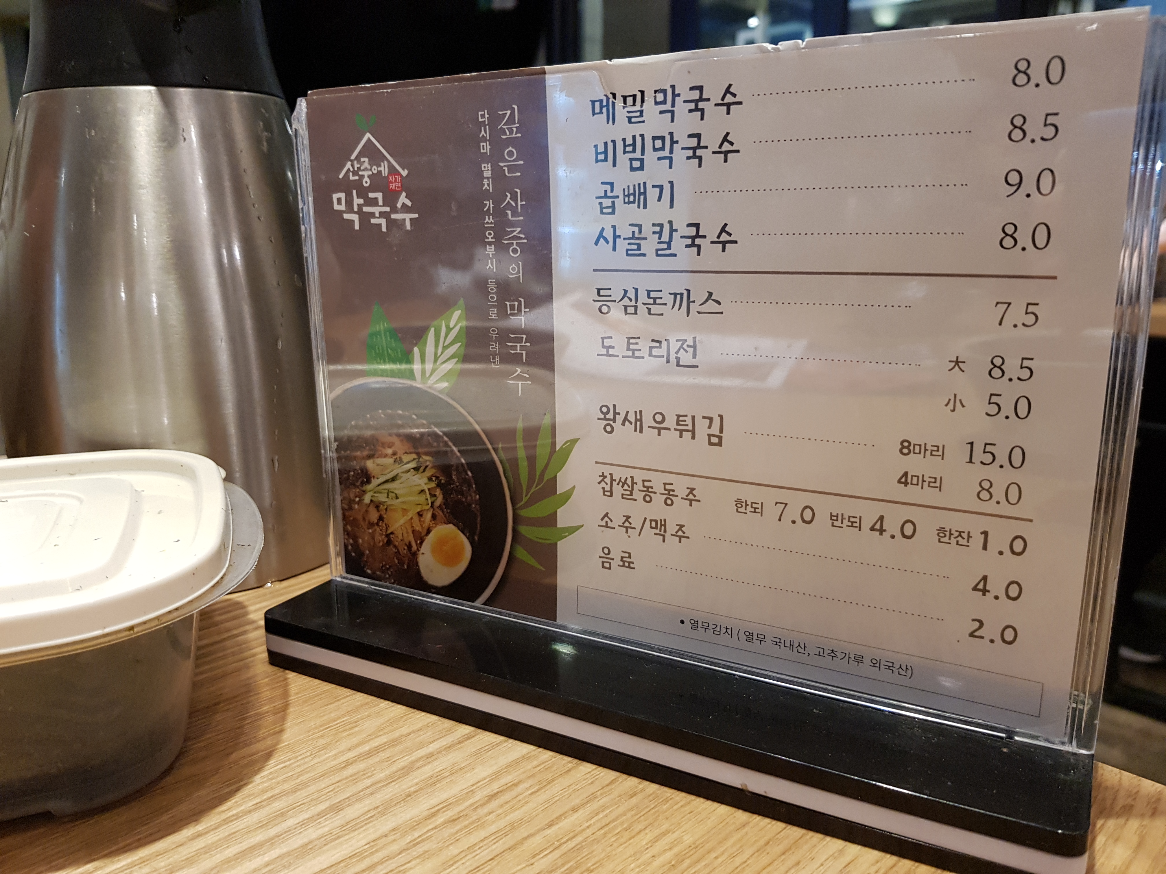 순한 맛의 불쭈꾸미를 먹기는 했지만 다 먹으니 땀이 송골송골 맺히더라고요. 그래서 준비되어있는 막국수를 먹었습니다. 2층에는 산중에 막국수라는 이름으로 영업을 하고 있는 전문점인데도 막국수 맛은 그냥 그랬어요.