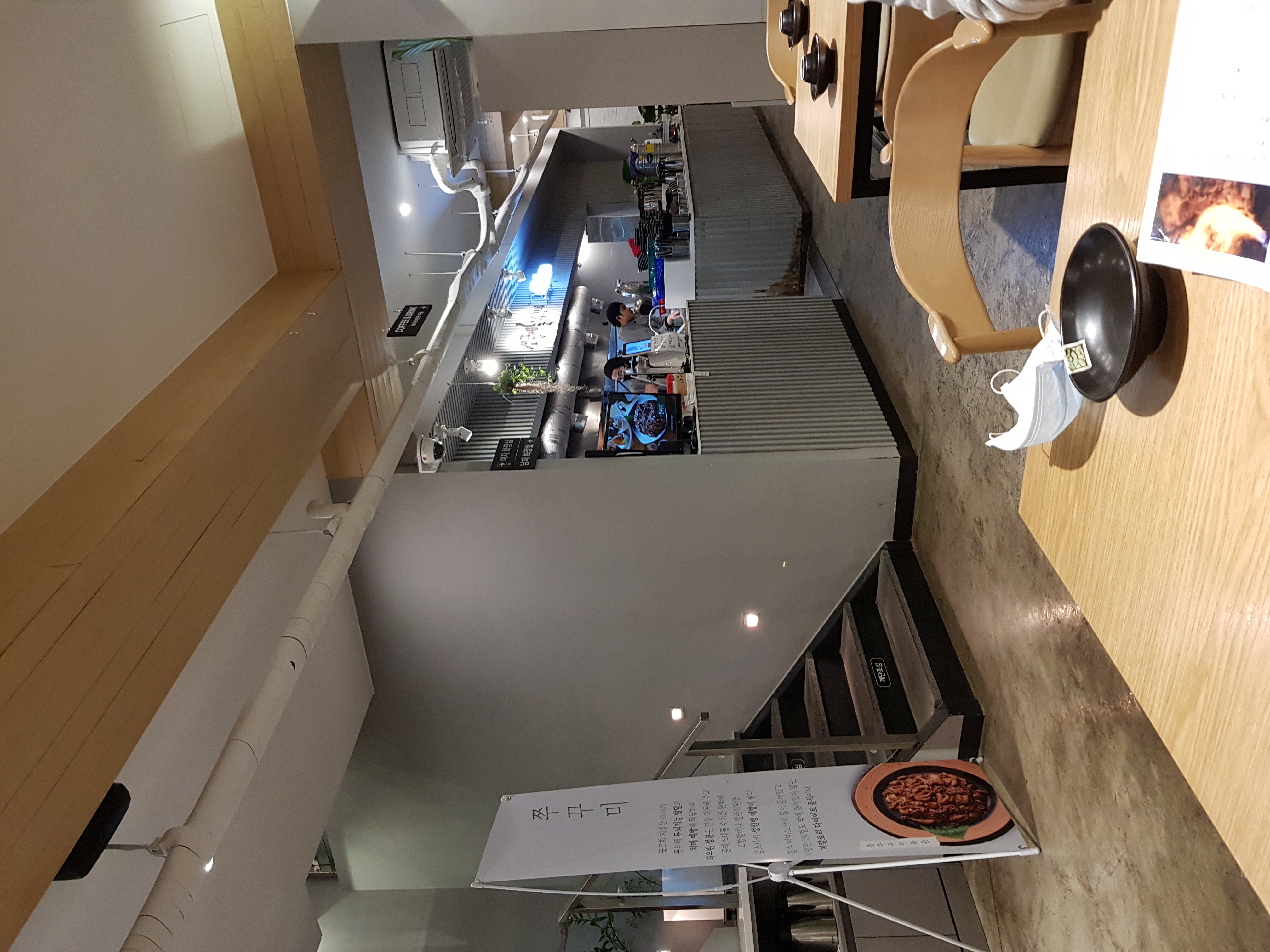 쭈꾸미 집은 많이 다녀보진 않았는데 입구에 딱 들어왔을 때 인테리어가 무슨 캐주얼한 양식 레스토랑 같은 분위기의 식당이었어요. 매장도 깔끔하고 종업원 분들 유니폼도 딱 있고 코로나 때문인지 모두들 마스크를 착용하고 계셨어요.