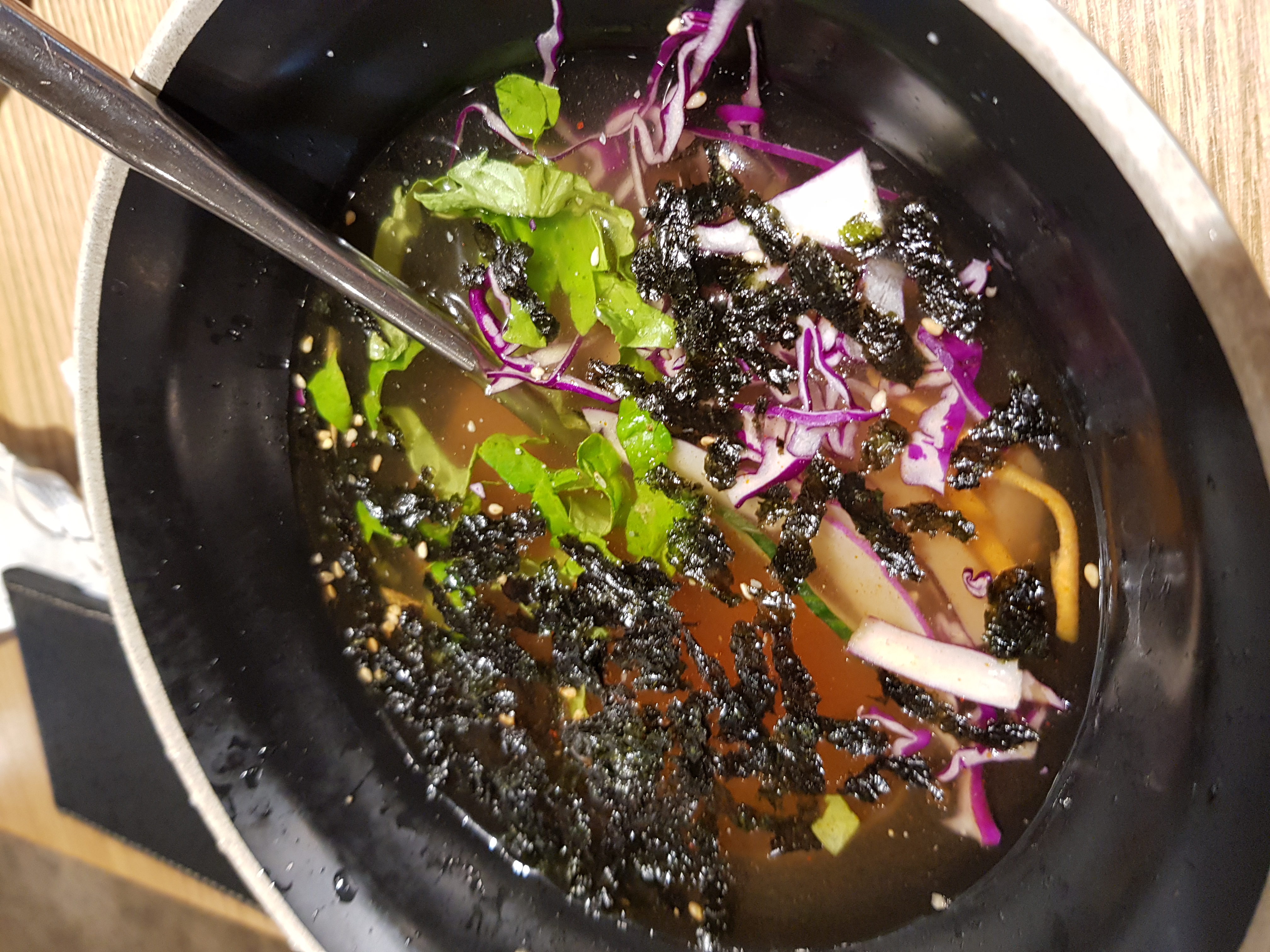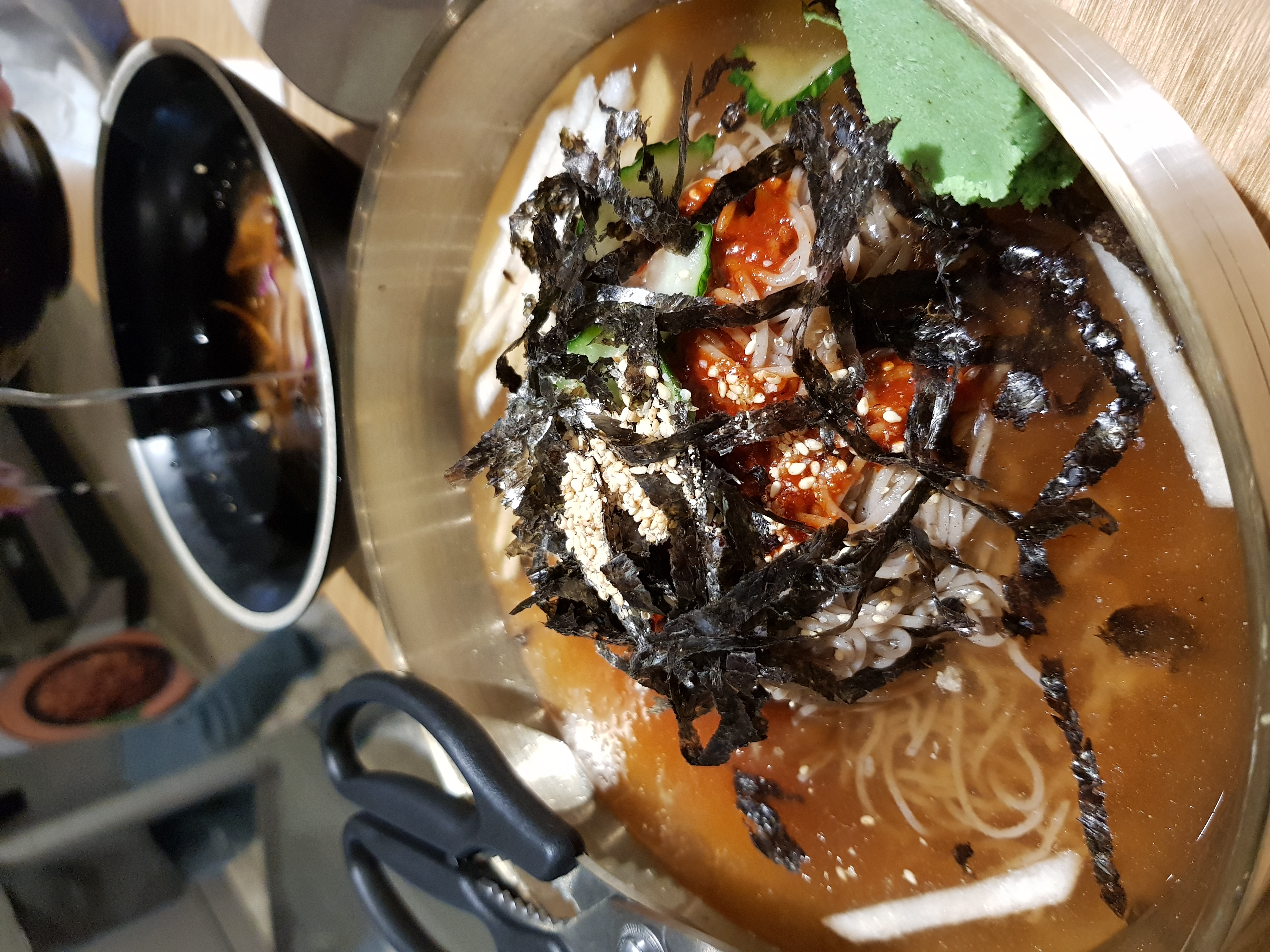 묵은 냉면육수 같은 것에 담겨서 위에 보이는 것처럼 김가루와 야채들과 같이 나옵니다.